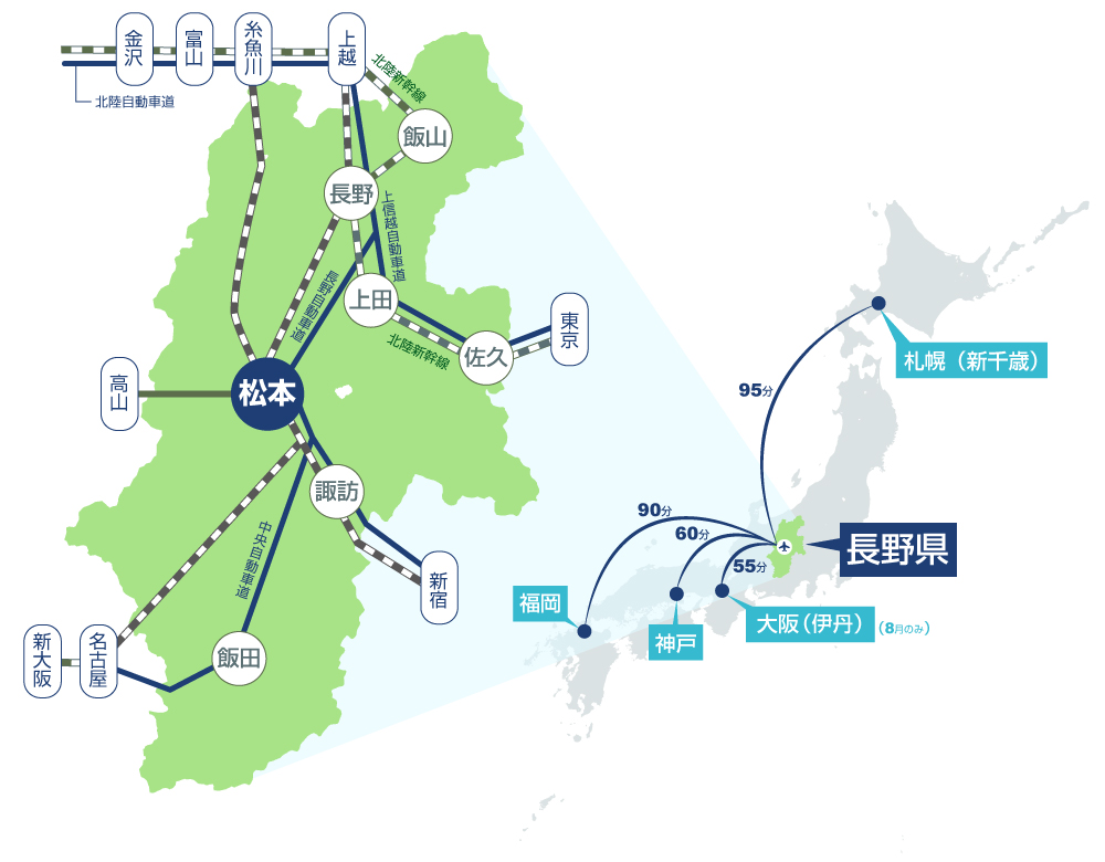 ※中央線特急あずさの大糸線直通は1日1往復運転 - 新宿 – [高速バス:新宿 – 安曇野 – 大町 – 白馬線] – 安曇野松川 – 信濃大町 – 白馬【 約5時間】